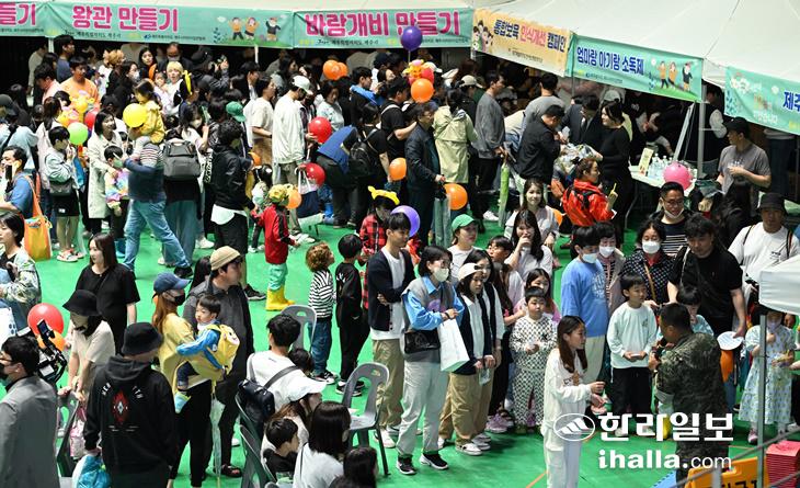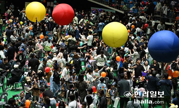5일 제주시 한라체육관에서 열린 어린이날 대축제를 찾은 어린이 등이 체험을 즐기고 있다. 강희만기자
