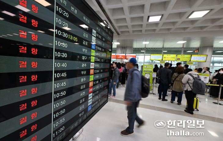 지난 5일 제주국제공항이 결항편 대체 항공권을 구하려는 여행객들로 붐비고 있다. 강희만기자