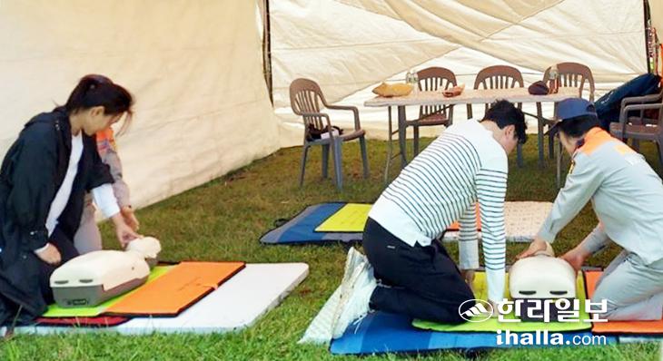 서귀포소방서 대신 남·여·다문화의용소방대(대장 김성봉·김명자·조숙자)는 지난 6일 서귀포시 강정동 강정체육공원 일대에서 제2회 강정마을 생태축제 축제 참석자를 대상으로 심폐소생술 실습 등을 진행했다.