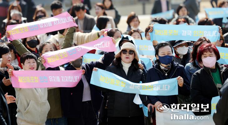 재외동포청 제주 서귀포 사수 범도민 운동본부가 지난 4월 제주도의회 정문 앞에서 기자회견을 하는 모습. 한라일보 DB