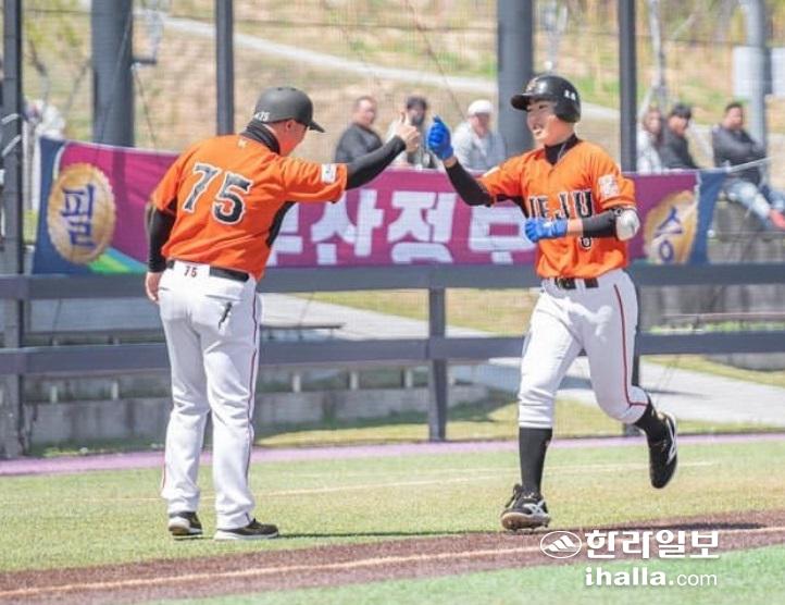 제주고야구가 2023 고교야구 주말리그를 통해 한층 더 성장한 전력을 갖춰나가고 있다. 지난 4월 9일 부산 기장 현대차 드림볼파크에서 열린 리그 전반기 1차전 부산정보고와의 경기에서 2회 투런홈런을 친 김지혁이 3루를 돌며 박재현 감독과 주먹인사를 나누고 있다.