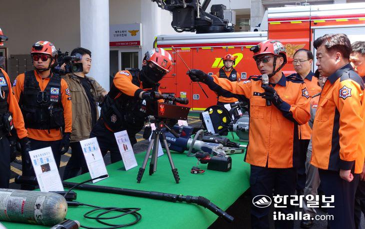현장대응단 출범식에 참석한 오영훈 제주도지사가 제주소방 특수 구조 장비에 대한 설명을 듣고 있다.