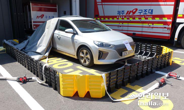 전기차 화재진압용 이동식 수조와 질식 소화포.