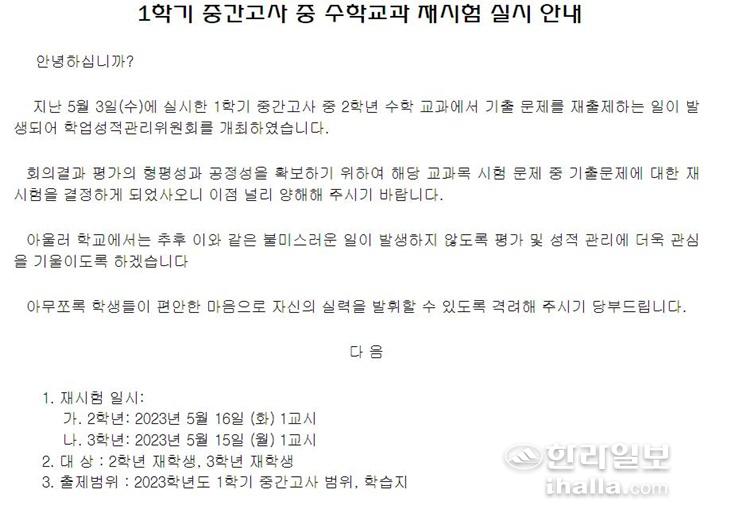 수학 교과 재시험을 알리는 가정통신문. 학교 홈페이지