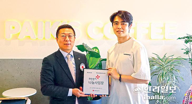 대한적십자사제주특별자치도지사(회장 정태근)는 지난 9일 제주시 해안동 소재 빽다방평화로SK점(대표 백승열)에서 적십자 희망풍차 나눔사업장 명패 전달식을 진행했다.