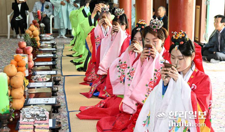 15일 제주향교에서 진행된 '제51회 성년의 날 전통 성년식'에서 성년자들이 술을 마시는 초례의식을 진행하고 있다. 강희만기자