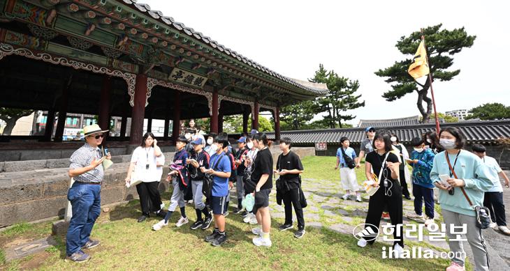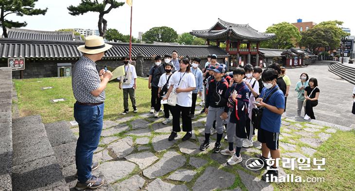 [한라일보] 17일 제주시 원도심에 자리 잡은 제주남초등학교 6학년 학생들이 관덕정 등 원도심 마을 탐방을 하며 제주의 문화와 역사를 배우고 있다. 이상국기자