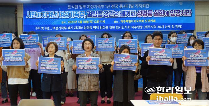 여성가족부 폐지 저지와 성평등 정책 강화를 위한 범시민사회 제주행동'이 18일 제주도의회에서 기자회견을 열고 있다.