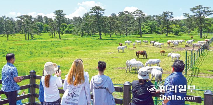 25일 제주시 용강동 마방목지를 찾은 관광객들이 제주마를 구경하고 있다. 이상국기자
