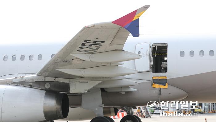 26일 오후 대구국제공항에 비상착륙한 아시아나 비행기의 비상구가 당시 비상개폐되며 파손된 모습을 보이고 있다.연합뉴스