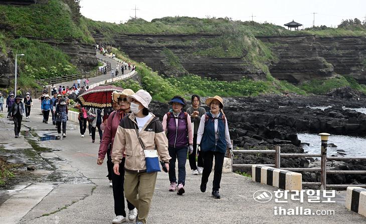 28일 탐방객들이 제주시 한경면 수월봉일대를 찾아 아름다운 풍광을 만끽하며 걷고 있다. 강희만 기자