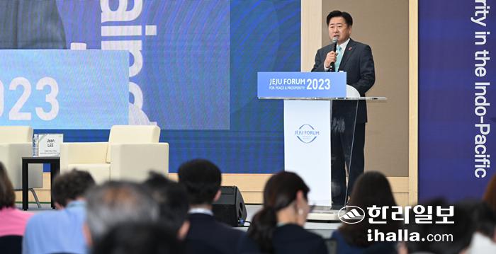 2023제주포럼 제주 4·3 과거사 해결 모델의 보편화·세계화 방안에서 기조발표하는 오영훈 제주지사. 이상국 기자