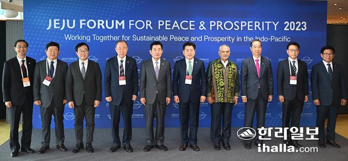 한덕수 국무총리가 1일 오전 제주 서귀포시 제주컨벤션센터에서 열린 제주포럼 개회식에서 참석 내빈들과 기념 촬영하고 있다. 왼쪽 두 번째부터 김광수 제주 교육감, 이도훈 외교부2차관, 반기문 전 유엔사무총장, 김진표 국회의장, 오영훈 제주도지사, 동티모르 대통령, 한덕수 총리. 더불어민주당 박광온 원내대표. 이상국 기자