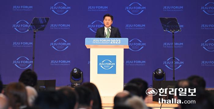 1일 오전 제주국제컨벤션센터에서 열린 제18회 평화와 번영을 위한 제주포럼 개회식에서 오영훈 제주지사가 개회사를 하고 있다. 이상국 기자