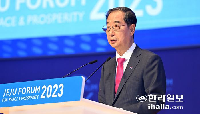 제18회 평화와 번영을 위한 제주포럼이 '인도-태평양 지역의 지속가능한 평화와 번영을 위한 협력'을 주제로 공식 개막한 가운데 한덕수 총리가 인사말을 하고 있다. 이상국기자