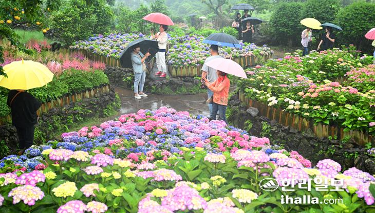 비날씨를 보인 1일 서귀포시 안덕면 마노르블랑을 찾은 관광객들이 우산을 쓴 채 수국을 배경으로 기념사진을 찍고 있다. 이상국기자