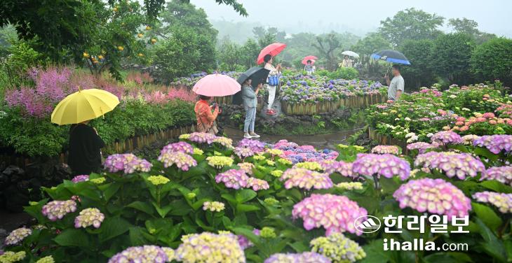 지난 1일 서귀포시 안덕면 마노르블랑을 찾은 관광객들이 우산을 쓰고 수국을 배경으로 기념사진을 찍고 있다.이상국기자