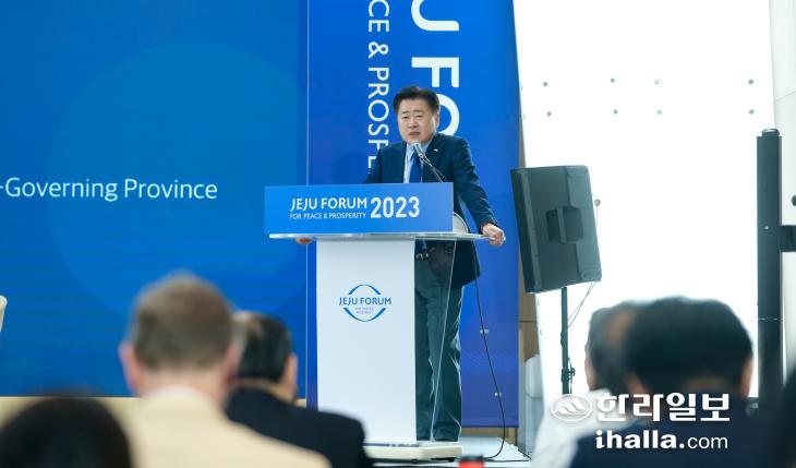 오영훈 제주도지사가 2일 제주포럼 폐막세션에서 '제주선언'을 밝히고 있다. 사진=제주특별자치도