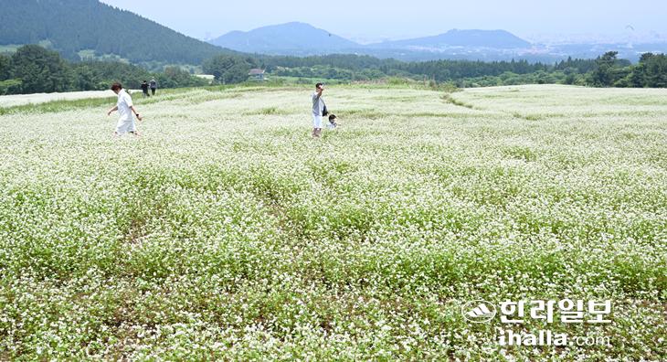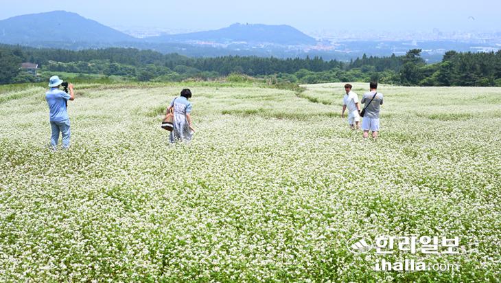 [한라일보] 7일 제주시 오라동 메밀꽃축제 현장을 찾은 관광객들이 메밀꽃을 배경으로 기념사진을 찍고 있다. 이상국기자
