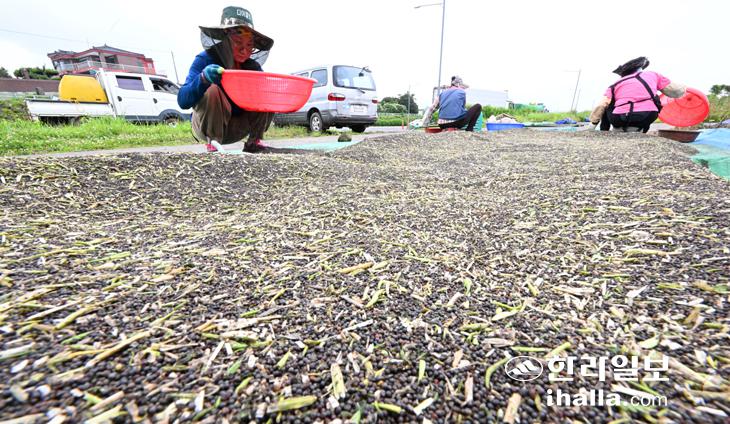 8일 제주시 조천읍 도로변에서 농민들이 건조한 유채 씨앗 털기 작업을 하고 있다. 이상국기자