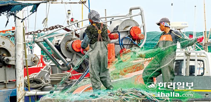 12일 제주시 한림항에서 어민들이 그물 정리 작업으로 분주한 시간을 보내고 있다. 이상국기자