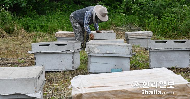 13일 제주시 조천읍 한 밭에서 양봉 농민이 벌집을 옮기며 분주한 시간을 보내고 있다. 이상국기자