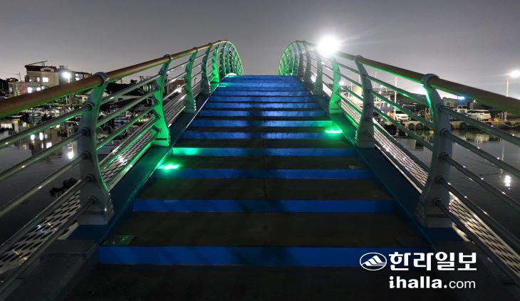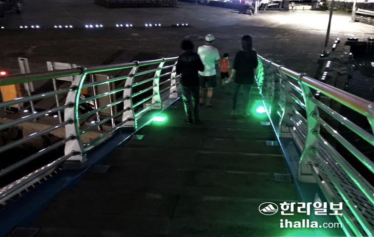 지난 13일 밤 조명등이 꺼진 제주시 화북포구 해신교를 산책하는 주민들의 모습.