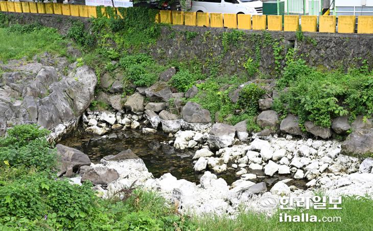 최근 제주시 삼도1동 병문천 일부 구간에서 물이 고인 웅덩이를 중심으로 하천 바닥이 하얀색 물질로 뒤덮이는 현상이 발생해 제주시가 조사에 나섰다. 제주시는 14일 해당 지역에 대한 수질 검사를 의뢰했다. 앞서 지난 2019년에도 같은 지점에서 이 같은 현상이 발생해 조사를 진행했지만 하천에 서식 중이던 미생물이 말라 붙은 것으로 추정된다는 결과가 나왔다. 이상국기자