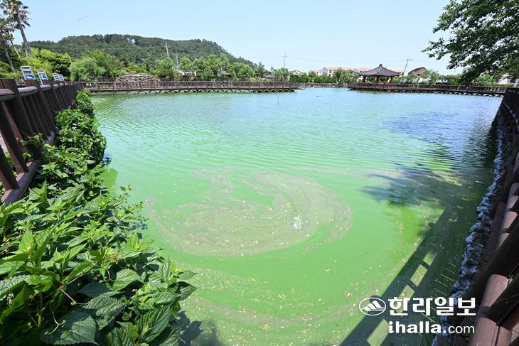 지난 14일 찾은 제주시 애월읍 하가리 연화지의 모습이다. 연꽃이 자라야 할 연못이 녹조로 뒤덮여 있다. 이상국기자