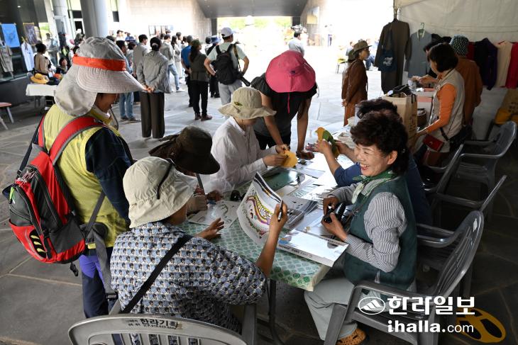 거문오름 트레킹을 돕는 해설사들이 마련한 부스에서는 옷·모자·신발 등을 나누는 아나바다 장터와 함께 세계자연유산 제주를 알리는 다양한 교재 등이 준비돼 아이와 어른 등 세대를 초월해 탐방객들의 발길을 사로잡았다.