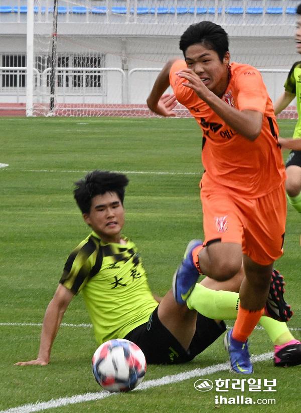 18일 제주종합경기장 주경기장에서 열린 전국체육대회 고등부 선발전 겸 제62회 전도종별축구선수권대회 제주유나이티드U18과 대기고의 결승전에서 제주유나이티드의 유예준이 대기고의 수비를 뚫고 돌파하고 있다. 이상국 기자