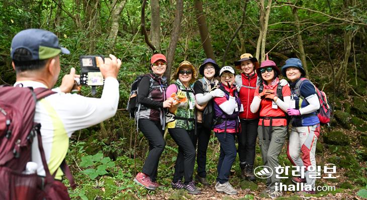거문오름 트레킹 행사가 열린 18일 용암길 탐방에 나선 체험객들이 기념사진을 찍고 있다. 이상국기자