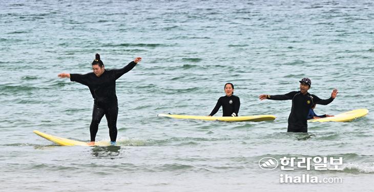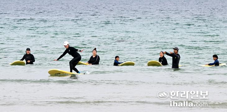 [한라일보] 19일 제주시 한림읍 협재해수욕장에서 관광객들이 서핑을 배우며 제주를 색다르게 즐기고 있다. 이상국기자