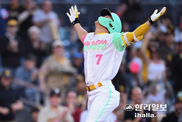 MLB서 첫 선두 타자 홈런 치고 양팔 벌려 기뻐하는 김하성. 연합뉴스