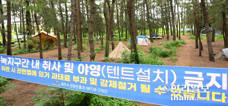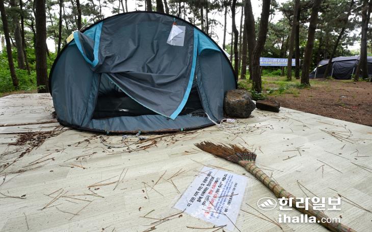 29일 제주시 한림읍 금능해수욕장 일대에 방치된 텐트 주변으로 불법행위 금지 현수막이 게시돼 있다. 이상국기자