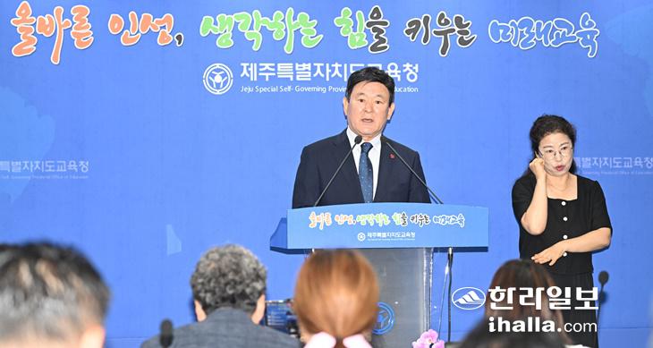 김광수 제주도교육감이 29일 제주도교육청 기자실에서 취임 1주년 기자회견을 하고 있다.이상국기자