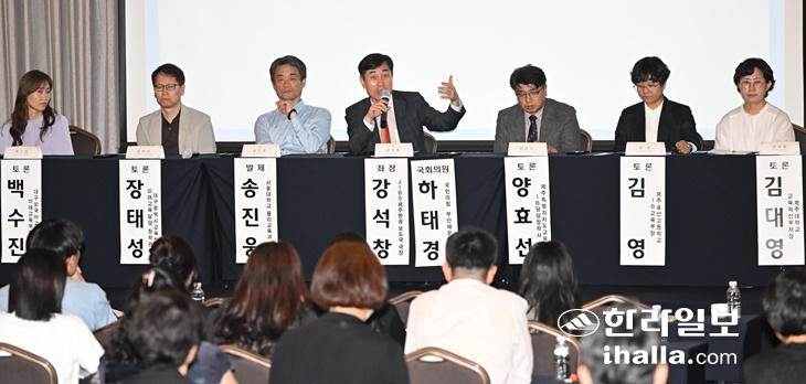 29일 제주도교육청과 국회 하태경·위성곤 의원이 공동 주최한 'IB, 대학입시 연계방안 모색 세미나' 토론이 진행되고 있다. 이상국기자