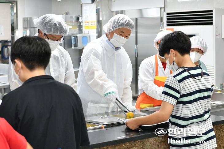 김광수 교육감이 30일 제주남초에서 급식 배식 봉사 활동을 하고 있다. 제주도교육청 제공