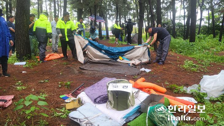 제주시가 30일 오후 협재·금능해수욕장 야영장에 장기 방치된 텐트를 철거하고 있다. 제주시 제공