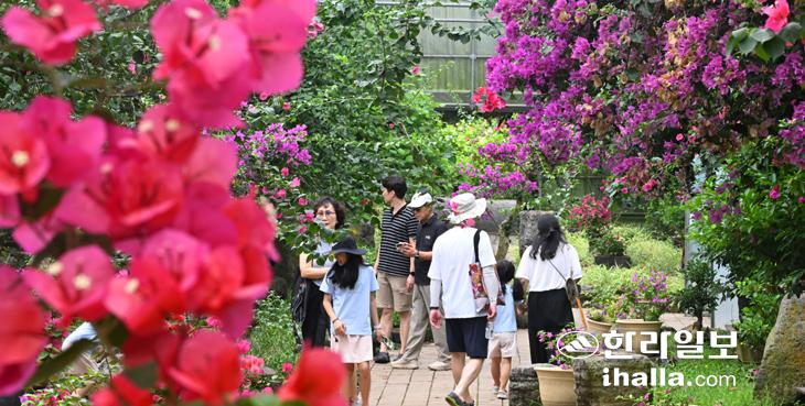 1일 제주시 한림공원을 찾은 관광객들이 활짝 핀 부겐빌레아 꽃을 구경하고있다. 이상국기자