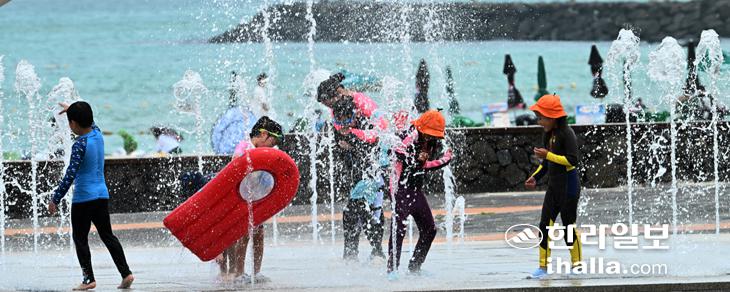 장마가 잠시 물러간 2일 제주시 애월읍 곽지해수욕장을 찾은 어린이들이 분수대에서 물놀이를 하며 더위를 식히고 있다. 강희만기자