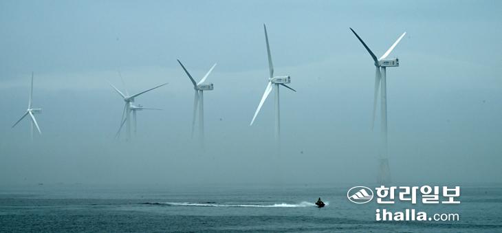 2일 풍력발전기가 설치된 제주시 한경면 앞바다가 해무에 뒤덮여 몽환적인 모습을 연출하고 있다. 강희만기자