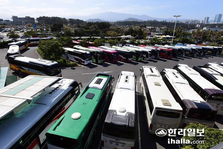 제주국제공항 주차장 내 전세버스. 한라일보DB