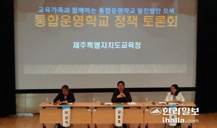 도심형 통합운영학교인 가칭 '월평초·중학교' 설립을 앞두고 있는 제주도교육청이 3일 제주학생문화원 소극장에서 기존 통합운영학교의 효율적 지원을 포함 발전 방안 모색을 위한 정책 토론회를 열고 있다. 진선희기자