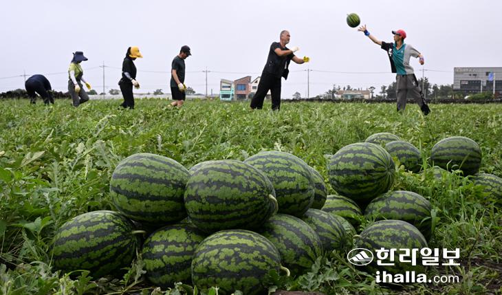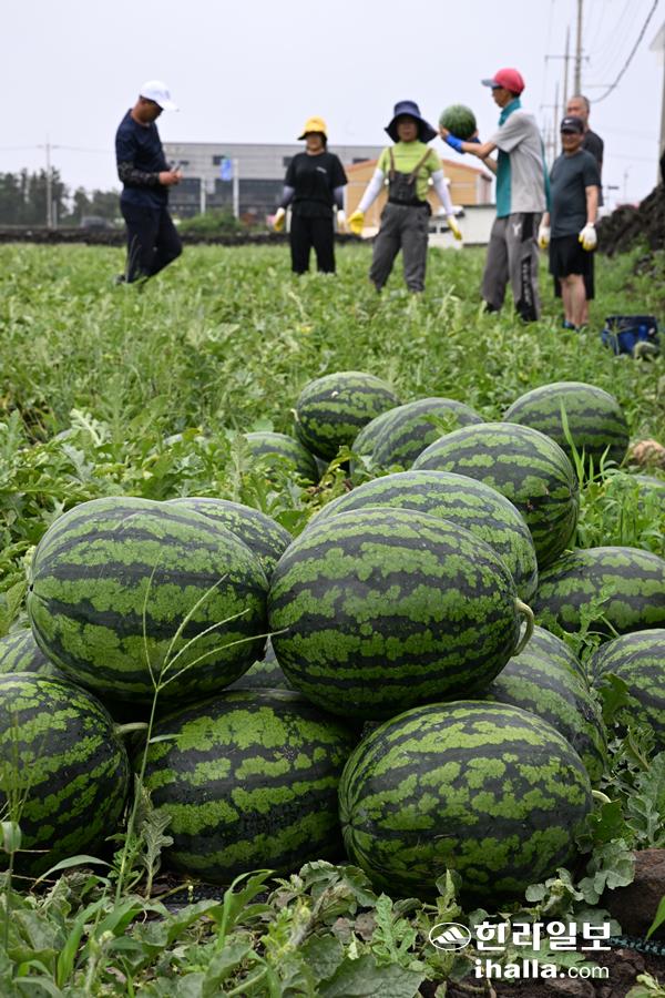 [한라일보] 장맛비가 내린 3일 제주시 애월읍 구엄리 들녘에서 농민들이 수박을 수확하고 있다. 강희만기자