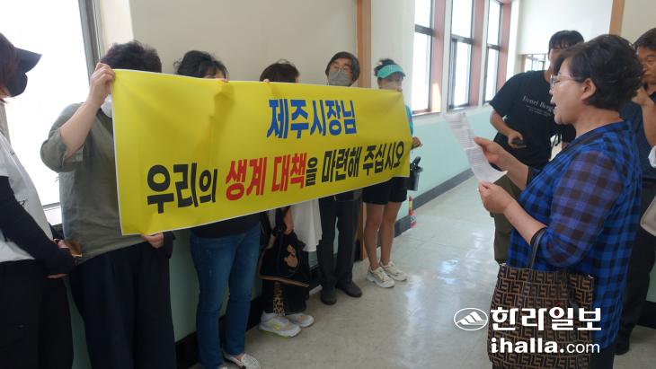 천장 붕괴 사고가 발생한 제주시 연동의 상가 건물 상인회 관계자들이 5일 제주시청에서 사고 수습 대책을 요구하고 있다. 김도영기자