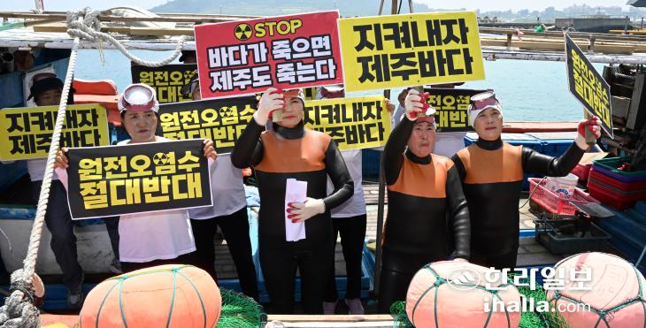 6일 후쿠시마 오염수 방류 반대 해상 시위에 나선 제주시 조천읍 함덕어촌계 해녀들. 이상국기자