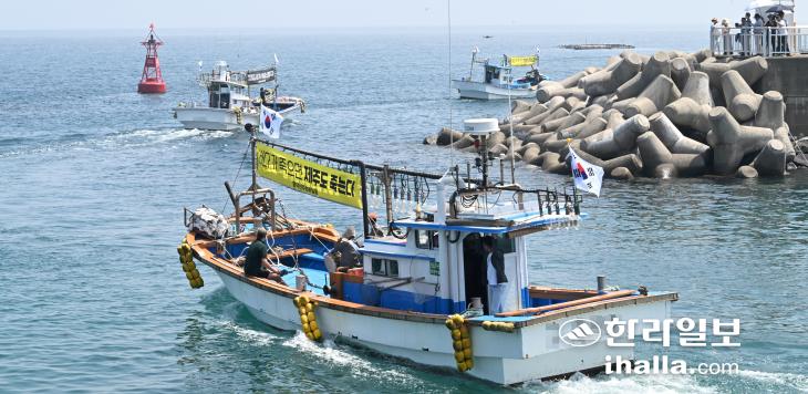 6일 제주시 조천읍 정주항에서 후쿠시마 오염수 방류 반대 해상 시위를 위해 바다로 출항하는 어선들. 이상국기자