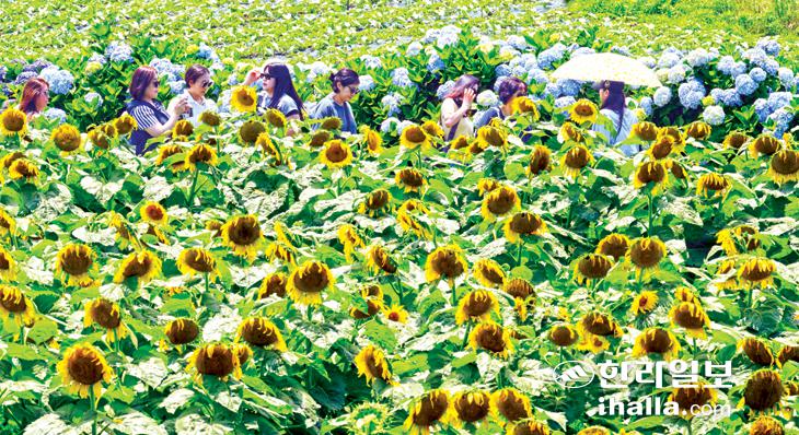 5일 제주시 회천동 소재 해바라기농장을 찾은 관광객들이 아름다운 꽃을 배경으로 기념사진을 찍고 있다. 이상국기자