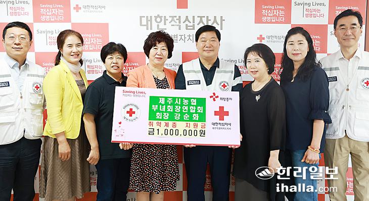 제주시농협 부녀회장연합회(회장 강순화)는 지난 5일 대한적십자사제주특별자치도지사(회장 정태근)를 방문해 이웃사랑나눔 바자회 수익금 100만원을 전달했다.